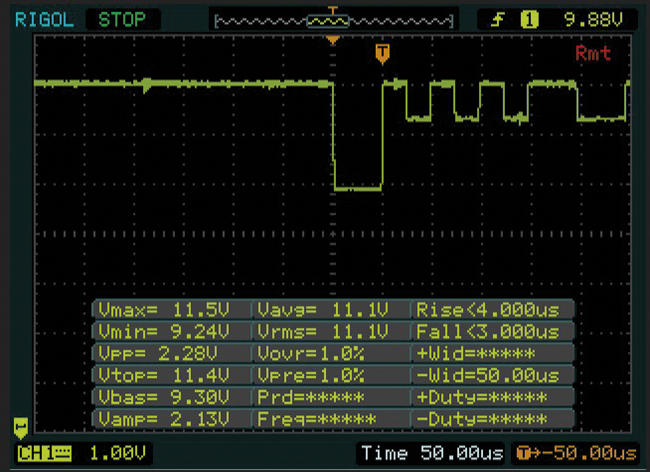 Her ses det rektangulære signal fra en ABS-sensor med hall effekt chip, som er i stand til at tælle tænder og registrere hjulets rotationsretning