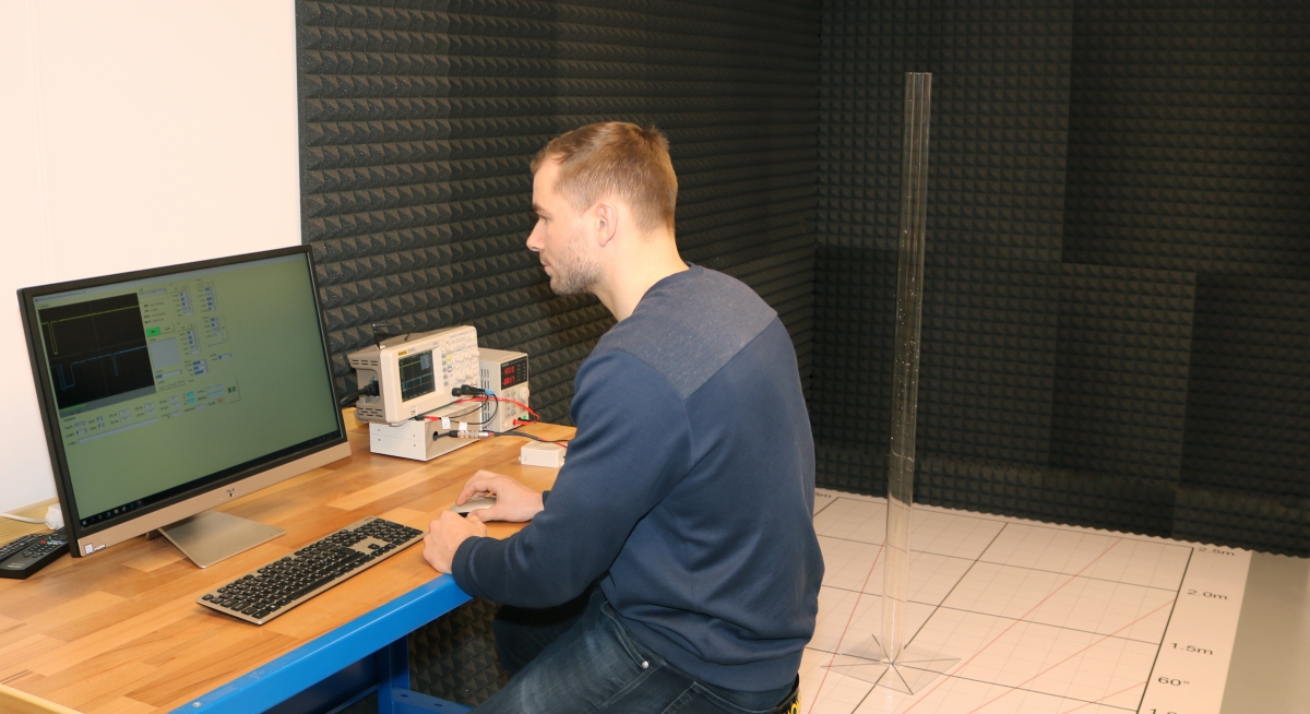 Damit keine ”falschen” Schallwellen reflektiert werden, sind die Wände neben dem Messbereich mit einem speziellen, absorbierenden Schaumstoff bekleidet
