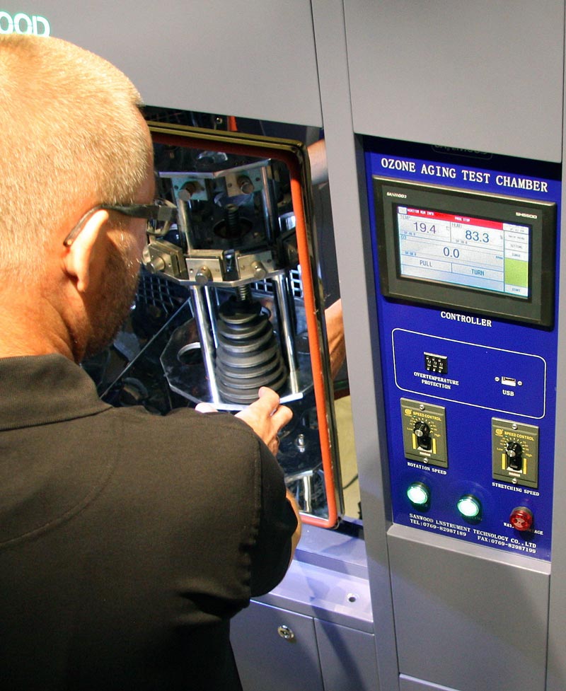 The photo shows a drive shaft boot ready for a test in Triscan’s ozone chamber