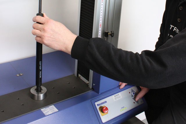 The photo shows a gas spring being tested in Triscan’s tensile and compression test equipment that can pull and push with up to 10 kN